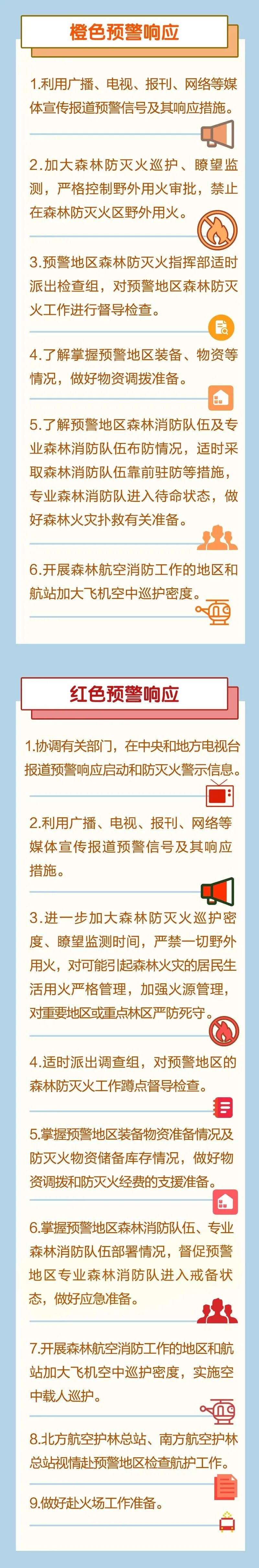 各地和有关部门要加强森林防火巡护和瞭望监测,做好森林防火宣传工作,严格野外火源管理,落实防火装备、物资等各项扑火准备。当地专业、半专业森林灭火队伍进入待命状态。