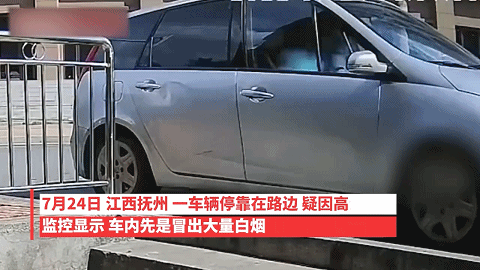 7月24日,江西抚州,一辆停靠在路边的汽车疑因“受不了”炙热的高温发生自燃。