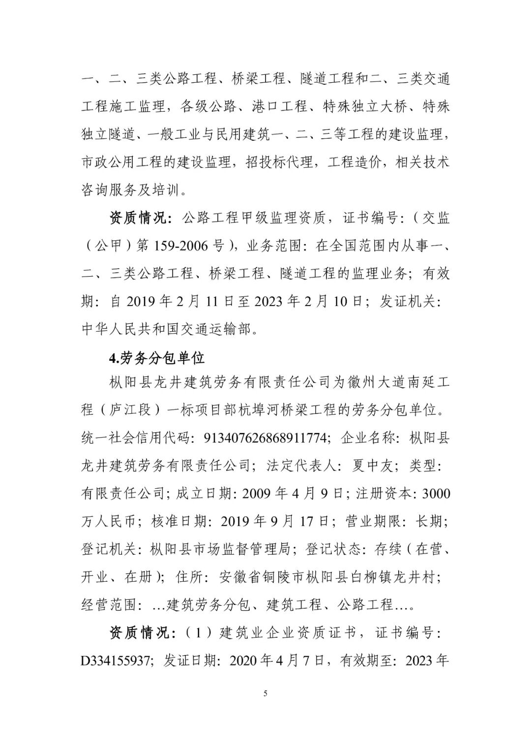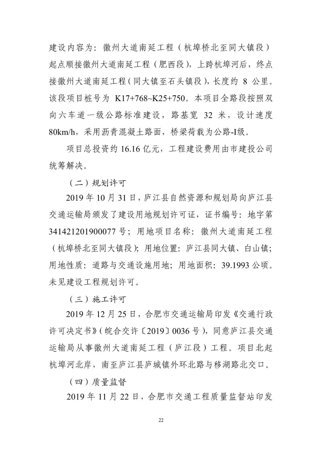 2021年8月18日,安徽省庐江县公安局以涉嫌重大责任事故罪对中铁北京工程局集团第一工程有限公司徽州大道南延工程32(庐江段)一标段项目部2人、枞阳县龙井建筑劳务有限责任公司徽州大道南延工程(庐江段)一标杭埠河桥梁工程3人采取刑事强制措施。
