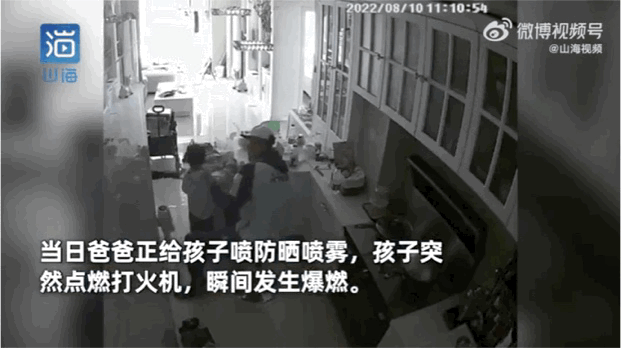 2022年8月10日,辽宁省沈阳市一位爸爸在出门时给孩子喷防晒喷雾,孩子玩打火机,防晒喷雾秒变“喷火枪”,场面十分惊险。