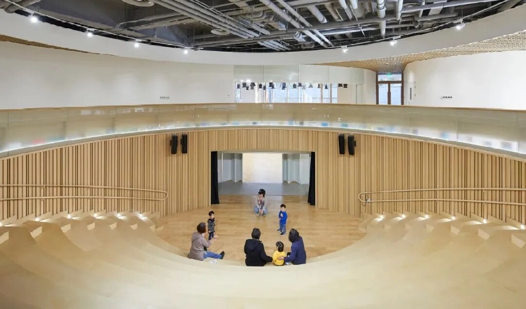 一层到负一层的过渡空间,是一个环形小剧场,表演节目、听老师讲故事,穿过去就是室内活动室。