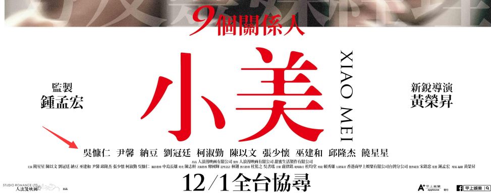 12月1日,入围金马三大奖项、2018香港国际电影节开幕片《小美》在台湾上映。该片云集了如今台湾的各路实力演员,是一个大群戏,围绕女主小美有九个关系人,吴慷仁位列在海报演员排位的第一,虽然他是最后一场的。