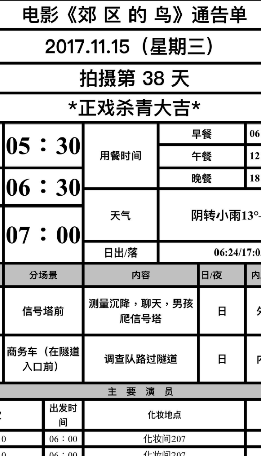 2017.10。我出席了⟪郊区的鸟⟫在一个杭州酒店前的开镜仪式,整个排期先拍孩子的部分,我看了公园的戏,小夏昊的戏很好。(我有一个信念,演员的表演比其他任何部门都重要,导演在现场最重要的工作就是和演员工作。)