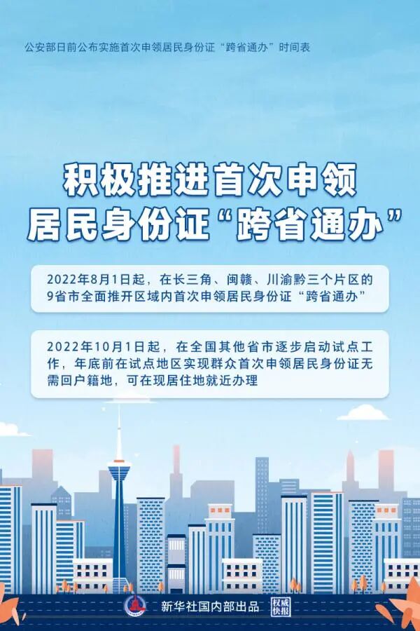 2022年8月1日起,在长三角、闽赣、川渝黔三个片区的9省市,全面推开区域内首次申领居民身份证“跨省通办”。