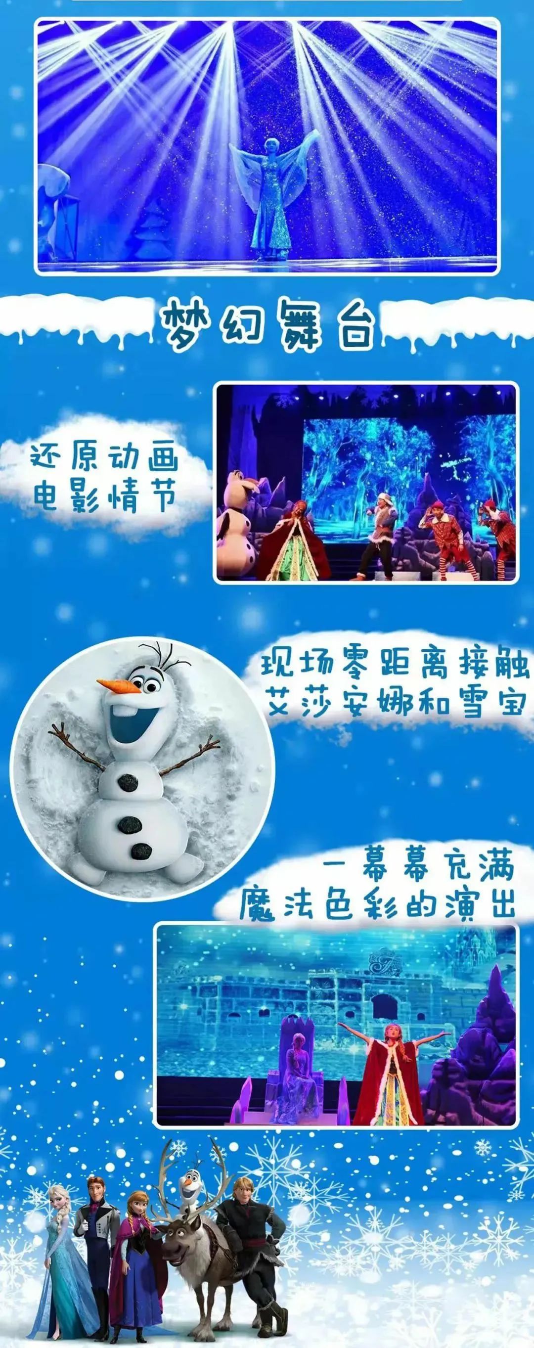 艾莎、安娜、雪宝、克里斯,角色众多、剧情丰富,让整个舞台变得张力十足,台词幽默生动,故事情节贴近现实生活,很多情节令孩子捧腹大笑,连大人也忍俊不禁。