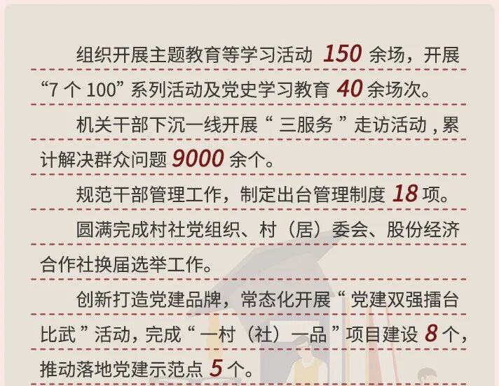 发展壮大农村集体经济,编制村级集体经济发展三年行动计划,出台村级留用地开发建设方案,明确7个村合计220亩的村级留用地安置事项;开展低收入农户高水平全面小康工作,全面消除村集体经济薄弱村,实现集体经济经营性收入“破千万”村(社)“零”突破。
