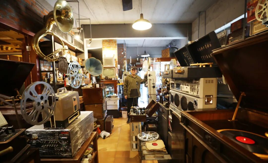 这位神秘的收藏家名叫王利龙,是一位瓶窑女婿。他有不少古董级电影放映机、留声机、摄像机,很多都是“国内第一台”、“国产最后一台”、“全球限量”的宝贝,还有绝版电影海报、胶片等等。