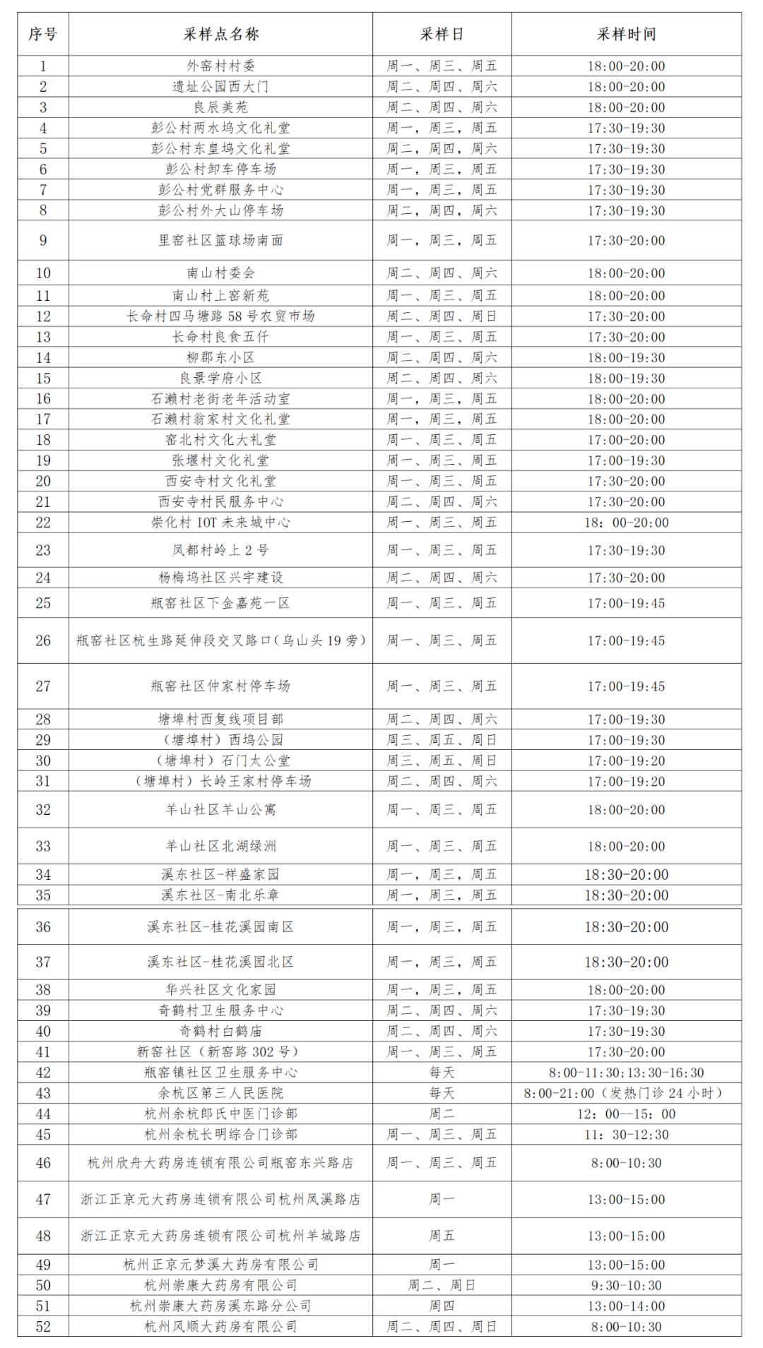 核酸采样点位公布如下: