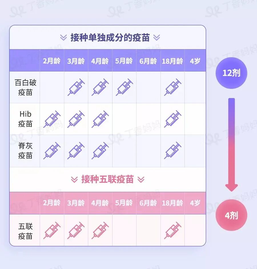 以五联疫苗为例,全程接种 4 剂就相当于完全分开来接种 12 剂,少了 8 剂(如下图)。