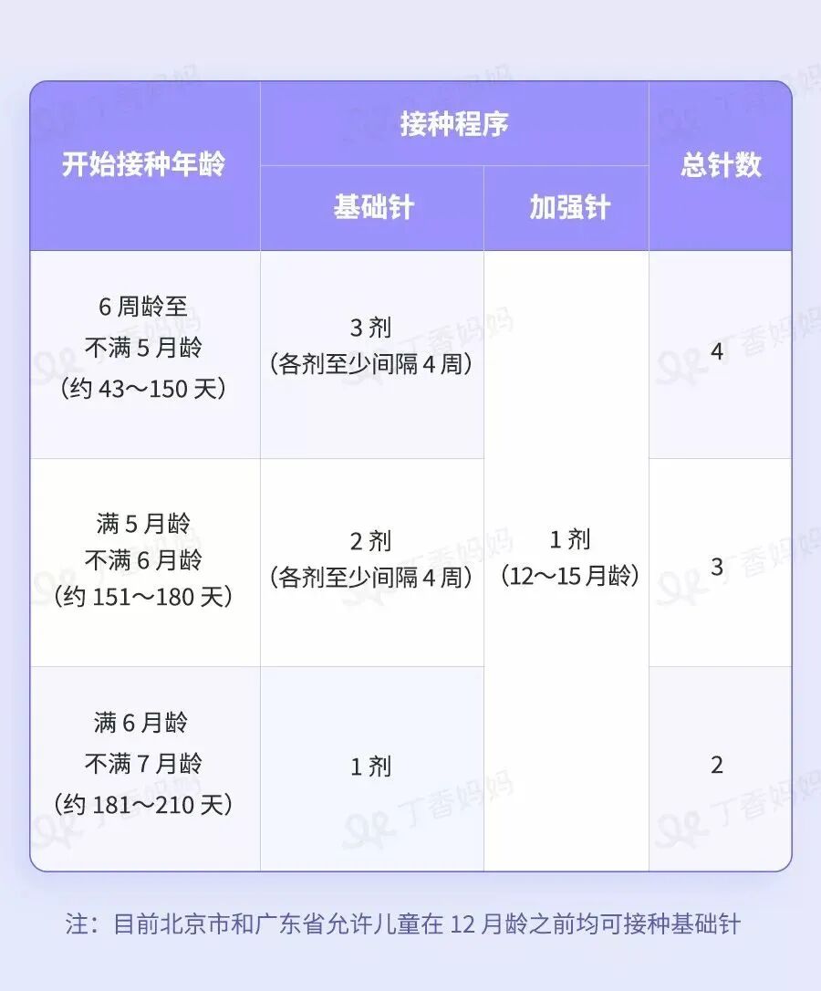 全程共 3 剂,每两剂之间需间隔 4~10 周。第 1 剂在 6~12 周龄完成;第 2 剂在 10~22 周龄完成;全部 3 剂在 8 月龄以内完成。每一剂都必须在规定年龄段内接种(同时要满足时间间隔)。
