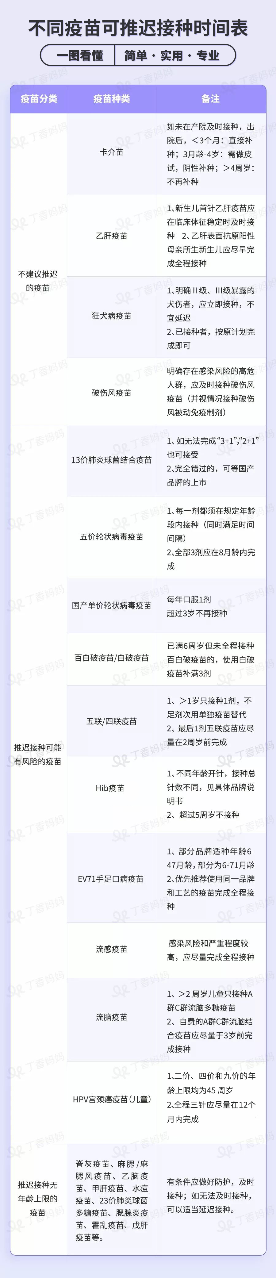 丁香妈妈咨询了疾控专业人士,结合丁香妈妈 App 会员的内容,针对孩子的疫苗进行详细分类,分为不能延迟接种、延迟接种但有风险、延迟接种无风险三种,做成了一张长图。