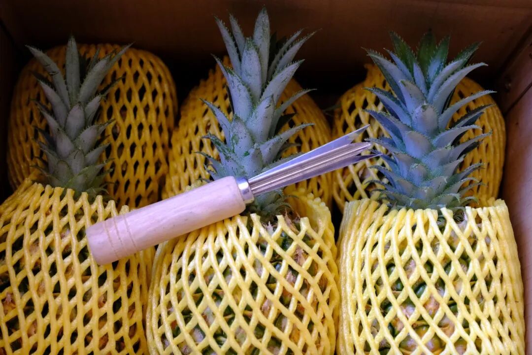 每个菠萝单独包裹泡沫网,不用担心压坏,还很贴心地附赠了一把菠萝刀。