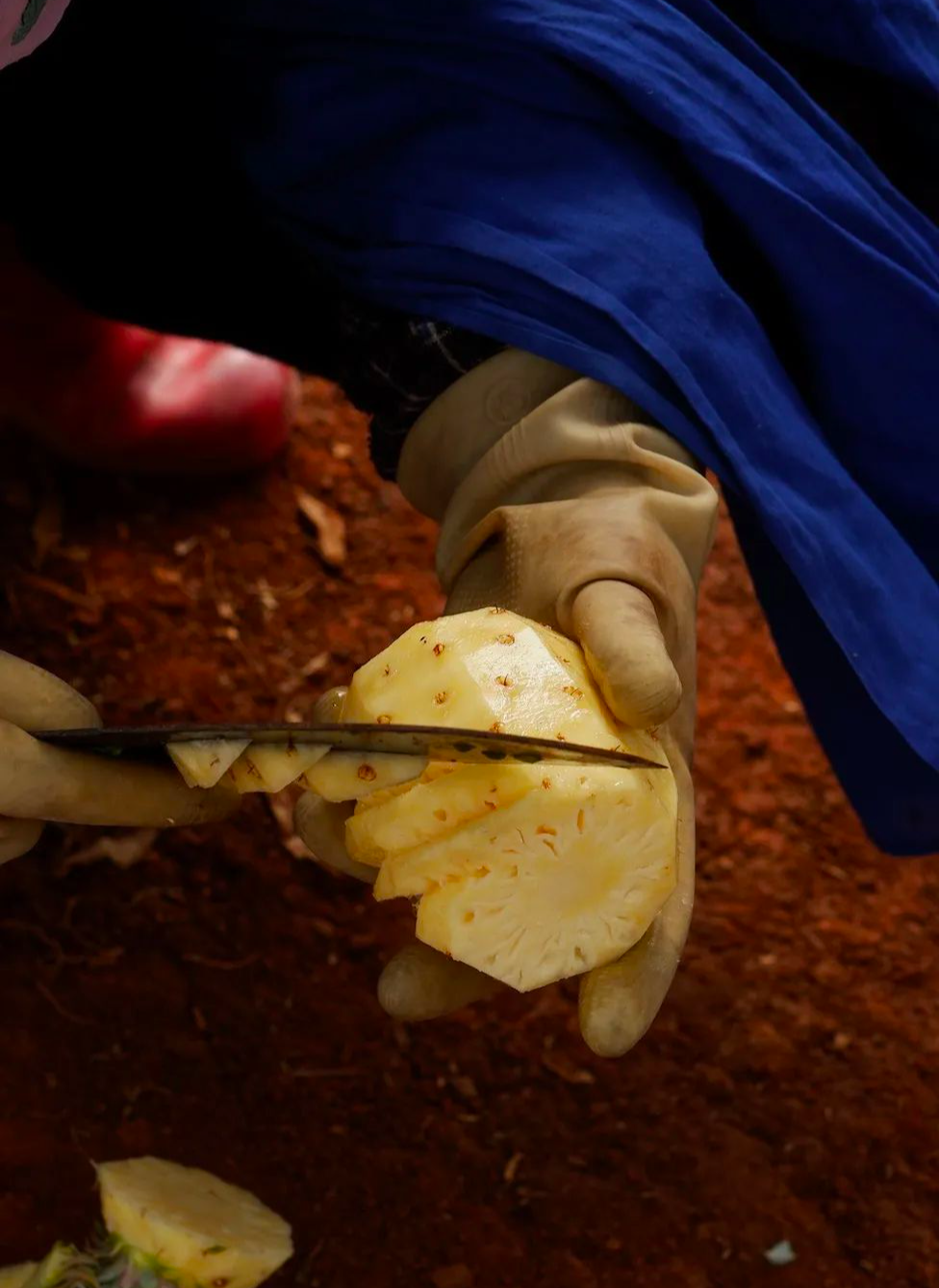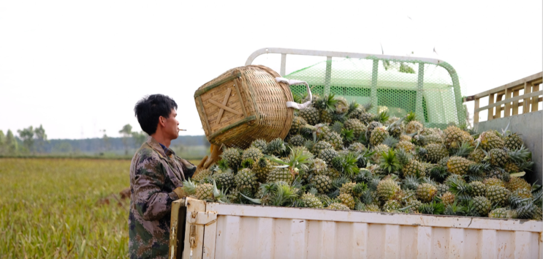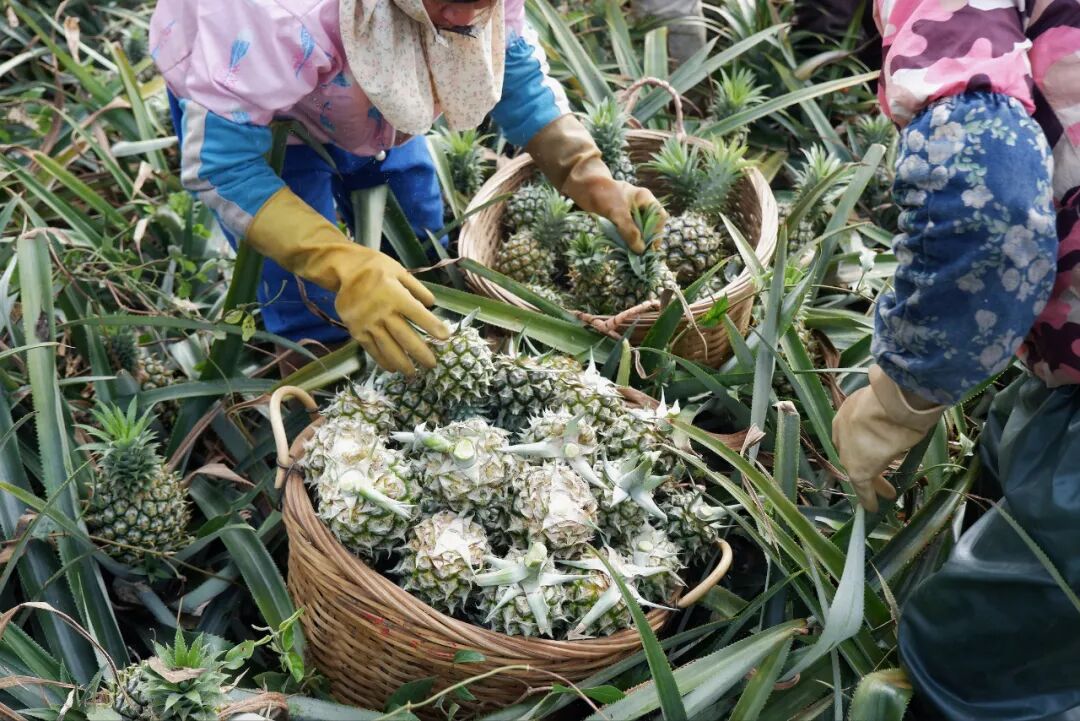 丰收季里,果农们每天都会带上厚厚的手套,穿梭在菠萝林的锯齿间,冒着被划伤的危险,和时间争分夺秒。