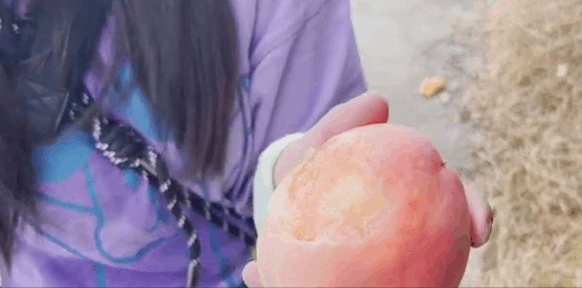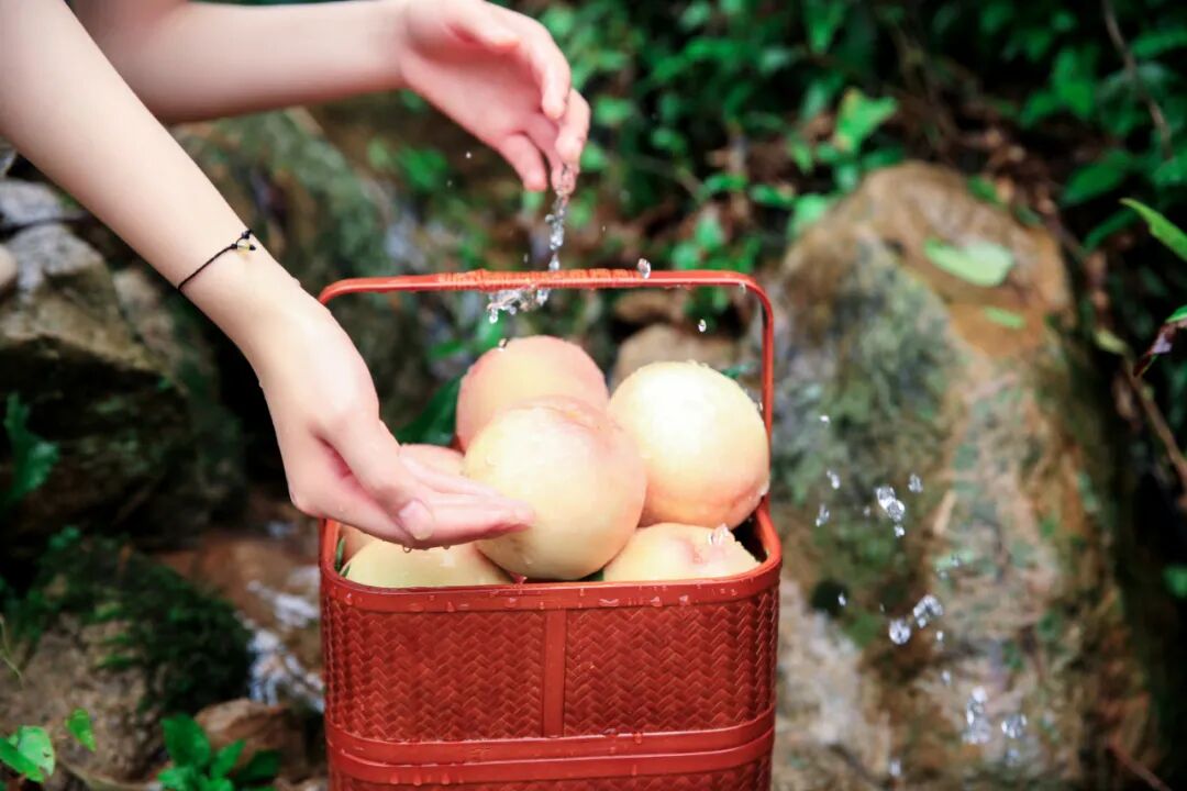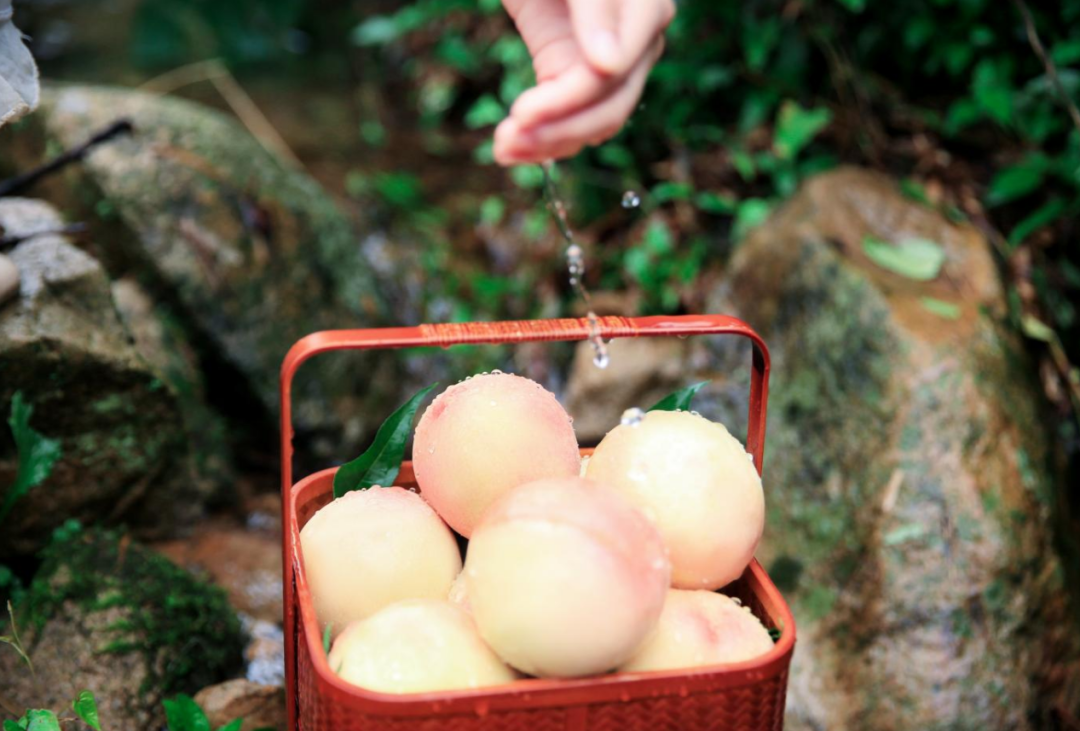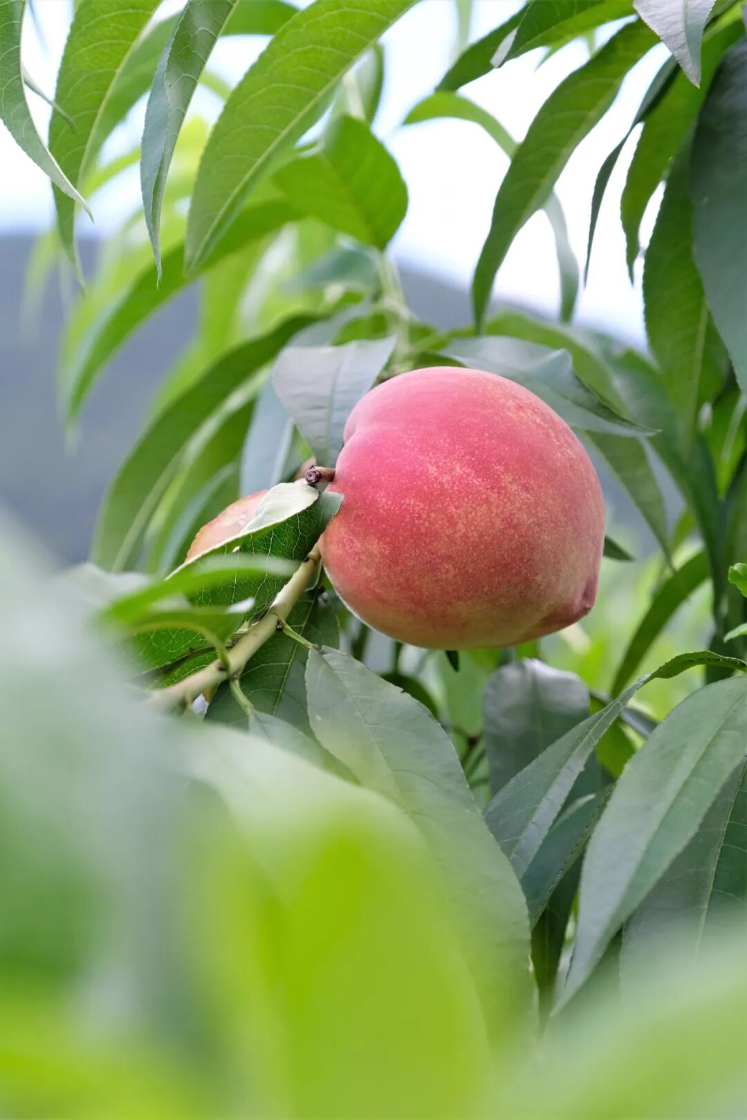 只等着吸满日光、喝足雨水,汲取土壤养分,沉淀出味道更丰富的甜蜜。市面上打着奉化水蜜桃名号售卖的假桃不少,想吃到正宗玉露不简单。所以阿球亲自去到奉化水蜜桃的核心产区,号称“天下第一桃园”的林家村,村子后面的整片山都是村民的桃园。有核心区的buff加成,只等着桃子们长得个头饱满,上市即可抢占龙头。成熟期的水蜜桃,连身上的点点桃斑都在无声宣告它足够浓甜。光是看着就知道这桃有多优秀。
