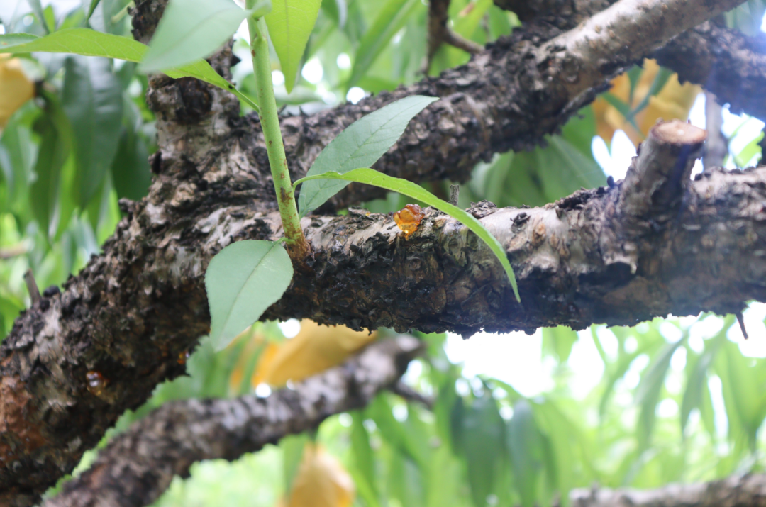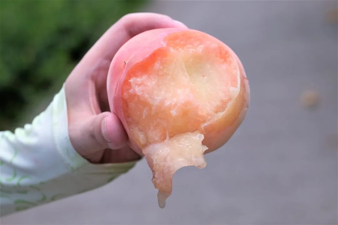 不少人对前面早熟期的桃都不带看一眼的,满心只有奉化玉露。据说种植历史长达2000多年,国家盖章其为“中国水蜜桃之乡”,被列入“国家地理标志保护产品”,央视等各大新闻更是接连报道。能种出这么优秀的桃子,奉化产地的自然条件绝对不一般。土壤肥沃、三面环山、光照足,种植于高山区,水流在山脚下延绵穿过。每年三月份开花到盛花期,漫山遍野都是娇嫩的粉,还有不少人驱车过来赏花。在这样的条件下,桃子长得也更茁壮,我们去的时候还看到了自然生长的桃胶。