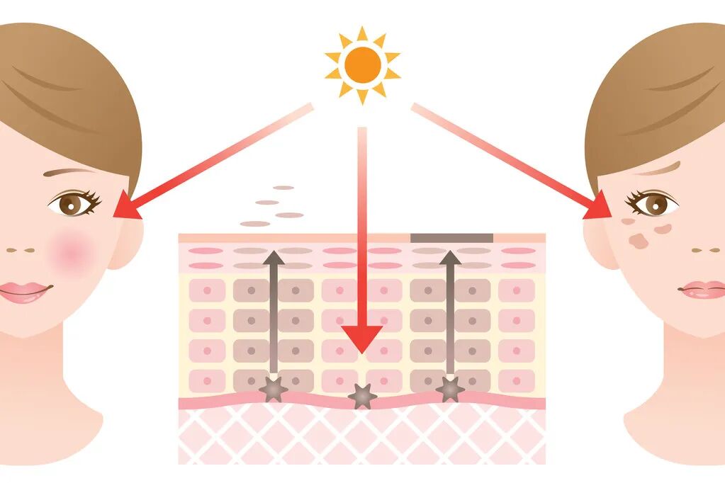 先说说色斑,它是黑色素表现在我们脸上的一个比较直接的形式,是我们的皮肤受刺激后,比如说日晒,就会分泌一些黑色素来进行“自我保护”,表现在脸上,就是斑斑点点了~