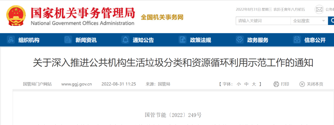 8月19日,国家机关事务管理局、住房和城乡建设部、国家发展和改革委员会、生态环境部四部门印发《关于深入推进公共机构生活垃圾分类和资源循环利用示范工作的通知》,详情如下: