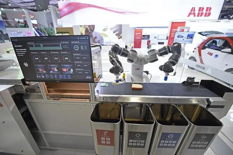 在上海举行的第二届进博会上,一家瑞士公司展出的全自动垃圾分类设备(2019年11月5日摄)。
