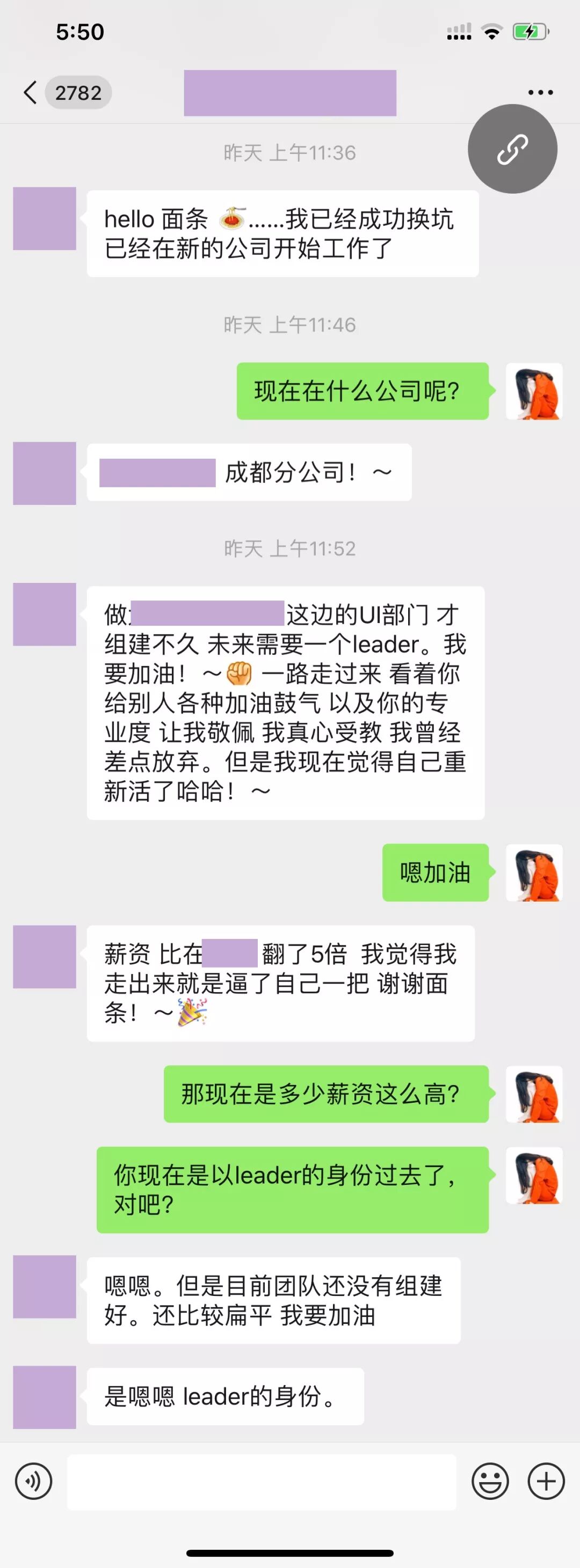 意外的是,她最后还是顺利拿到了那家在业内还算比较大的公司的offer,而且薪资涨了近一倍,于是才有了那天她高兴地跑来跟我报喜的聊天内容。