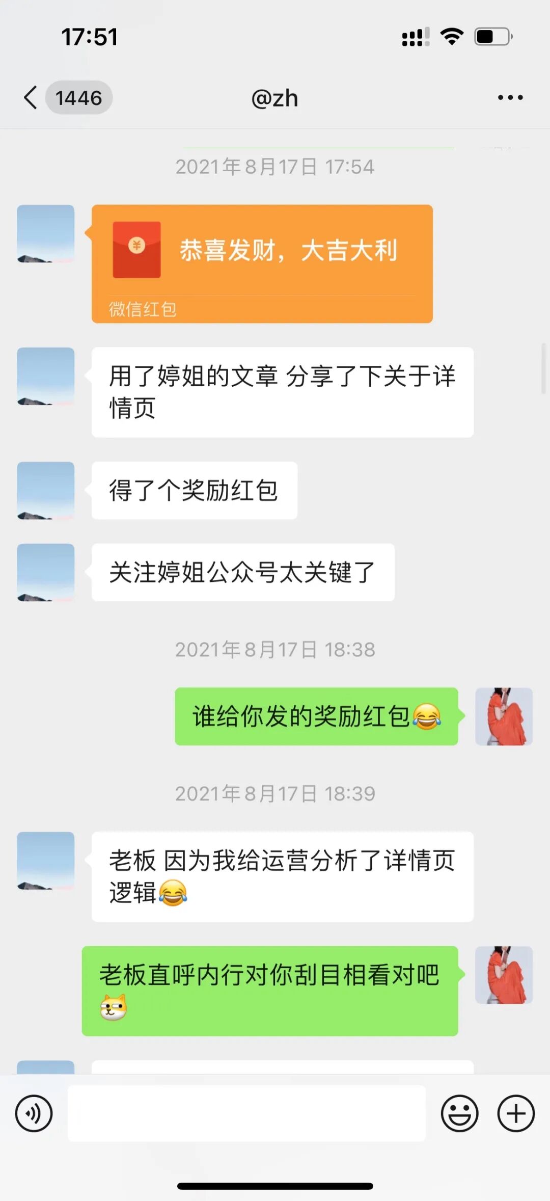 然后如果因为这种分享行为被老板奖励了,他也会回来给我发红包作为对我的感谢,当然,虽然红包我没收,但是起码说明了他是个懂得感恩的人:
