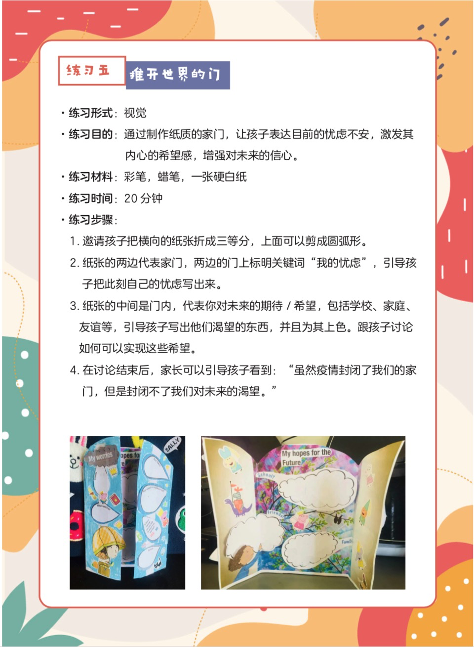 我们希望通过提供一系列轻松、有趣、有爱的练习帮助家长缓解心理压力,获得易操作的练习指南来帮助儿童和自己调节心理状态,重新建立有秩序的生活节奏,在有限的空间里创造幸福的生活。