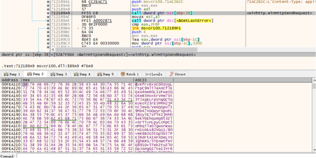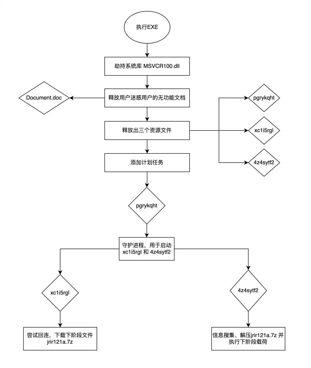本次攻击活动样本同样使用了白加黑手法,白文件为Office WINWORD.EXE,黑文件为MSVCR100.dll。