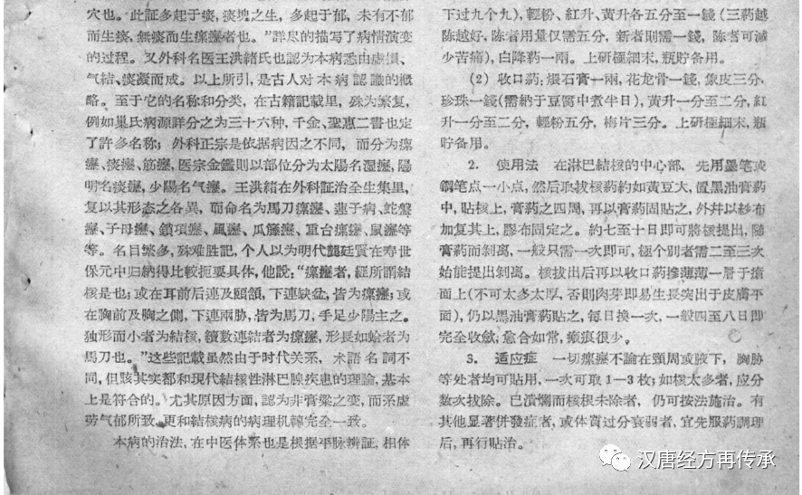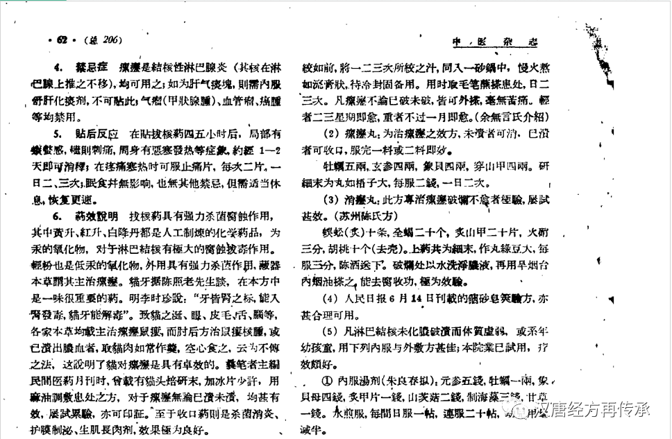 (1)紫玉簪膏:取紫玉簪花,连根茎花叶(不开花时,取根款汁亦可), 不论多少,勿洗去根上泥,置石臼中,以石杵杵之(不经铜铁器),俟烂如泥,入布袋中绞汁;其渣入臼,量加陈醋再捣,再绞取汁;其渣再加醋捣绞如前,将一二三次所绞之汁,同入一砂蜗中,慢火熬如流膏状,待冷封固备用。用时取毛笔蘸搽患处,日二三次。凡瘰疬不论已破未破,皆可外搽,毫无苦痛。轻者二三星期即愈,重者不过一月即愈。(余无言氏介绍)(2)瘰病丸:为治瘰疬之效方,未溃者可消,已溃者可收口,服完一料或二料即效。牡蛎五两,玄参四两,象贝四两,穿山甲四两,研细末为丸如梧子大,每服二钱,一日二次。(3)消疬丸:此方专治瘰疬破烂不愈者极验,屡试甚效。(苏州陈氏方)蜈蚣(炙)十条,全蝎二十个,炙山甲二十片,火硝三分,胡桃十个(去壳)。上药共为细末,作丸绿豆大,每服三分,陈洒送下。破烂处以水洗净脓液,再用旱烟台内烟油搽之,能去腐收功,极为效验。(4)人民日报6月14日刊载的砂皂荚验方,亦甚合理可用。(5)凡淋巴结核未化脓破溃而体质虚弱,或系年幼孩童,用下列内服与外敷方甚佳;本院业已试用,疗效颇好。①内服汤剂(朱良春拟):元参五钱,牡蛎一两,象贝母四钱,炙甲片一钱,山茨菇二钱,制海藻三钱,甘草一钱。水煎服,每间日服一帖,连服二十帖,幼儿用量减半。②外敷方(无论瘰疬、煐核、马刀、便毒及一切无名肿毒,肿痛未溃者,均可用此消散。):茅菇五钱,芙蓉叶五钱,胆矾钱半,滕黄、生南星、生川乌、生草乌各三钱、铜绿、雄黄、硼砂各钱半。共研细末,用葱汁与蜜调敷,或醋调敷,敷时须留疮顶如绿豆大一处勿敷,以出毒气。此药不可入口,每日换药一次,敷后一周,疬核即见软缩,最慢者约一月左右,基本上可以完全消散。倘局部有皮炎泡疹出现者,可暂停一二日再敷。以上简略谈了一谈有关瘰疬及其治疗的问题,由于我院瘰疬科建立伊始,还未能作更具体的说明,今后将作进一步的观察比较,统计疗效,从而总结经验,加以推广,为瘰疬患者早日解除疾苦;同时并希医疗单位或病员同志将有关治疗方面的情况告诉我们,作为工作中的参考。本文转载自中医杂志1959年3期第61页上,作者为国医大师朱良春,转载本文仅为传承中医,不会用于营利,如有侵权,请联系我们删除。往期精彩内容:
