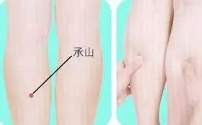 承山穴:位于人体的小腿后面正中。当伸直小腿或足跟上提时,腓肠肌肌腹下出现的尖角凹陷处即是。