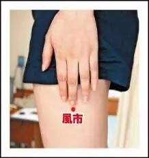 风市穴:位于大腿外侧部的中线上。直立,手下垂于体侧,中指尖所到处即是。