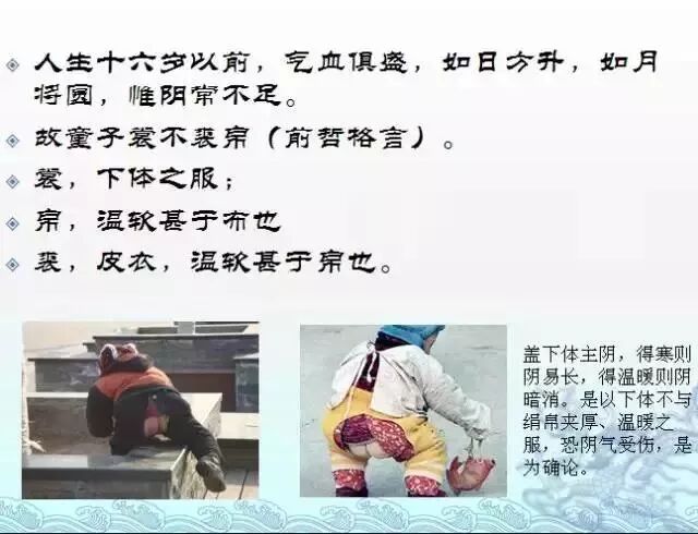 万密斋就说了:“童子,裳不裘帛。”什么意思?裳,下体的衣服;帛,温软甚于布;裘,皮衣,温软甚于帛。也就是说,下体要穿得薄,你在下面不能用厚厚的棉絮裹,更不该下面穿皮衣。