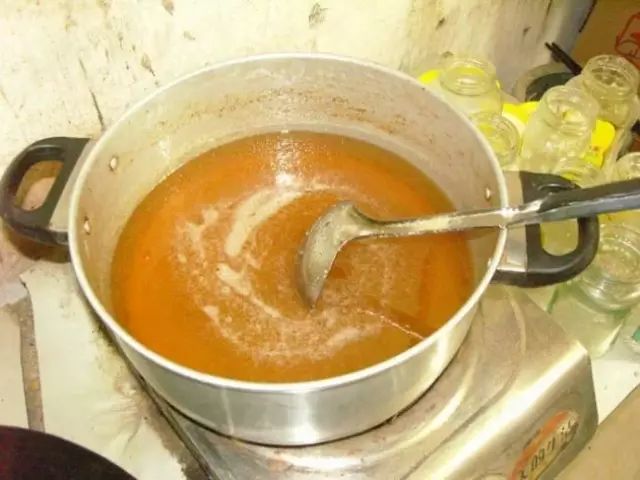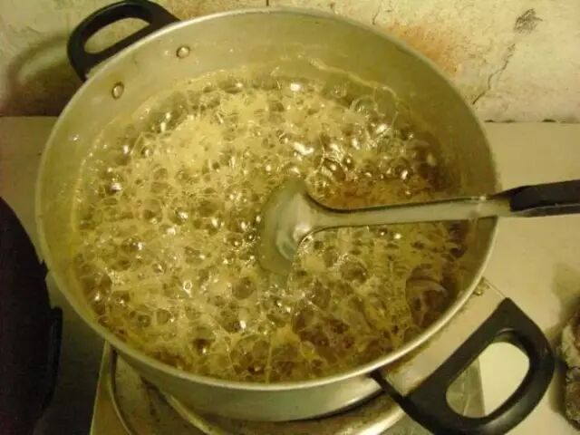 3、炼蜜:炼蜜即熬炼蜂蜜,炼蜜的目的是去除杂质,破坏酵素,杀灭细菌,蒸发水分,增强粘性。炼蜜时先用武火熬沸,然后改为文火慢熬,同时在旁边放一碗凉水,并注意观察蜂蜜的颜色,当发现蜂蜜泛黄沫时,用一根竹筷在蜂蜜中沾上一滴,然后把竹筷挪到凉水碗上方,让蜂蜜滴入水中,如果蜂蜜在水中不散开而沉底(即“滴水成珠”),蜂蜜就算炼好了。(如果蜂蜜炼不到火候,就作不了药丸,当然,太过火也不好,所以一定掌握火候。炼蜜分为三种,即嫩蜜、中蜜和老蜜:“嫩蜜”是将生蜜加热煮沸直到温度达到105℃~115℃,过滤去沫即成,其颜色变化不显著,失水量较少,稍带粘性,适用于含较多淀粉、粘液质、糖类、脂肪等粘性较大的药材制丸;“中蜜”是将生蜜加热熬沸较长时间或将嫩蜜继续加热至116℃~118℃,泡沫呈浅红色光泽,手捻有粘性,但不能拉成长的白丝,适用于含部分粘性或部分纤维的药材制丸;“老蜜”是将生蜜加热更长的时间或将嫩蜜、中蜜继续加热至119℃~122℃,使水分充分蒸发,气泡呈红棕色,有光泽,手捻甚粘,且可拉出白丝,适用于含多量纤维性或矿物等粘性较差的药材制丸。制蜜丸大多使用中蜜,1000g蜂蜜大约能出炼蜜800g左右,1000g中药粉,大约须用炼好的蜂蜜1200g左右