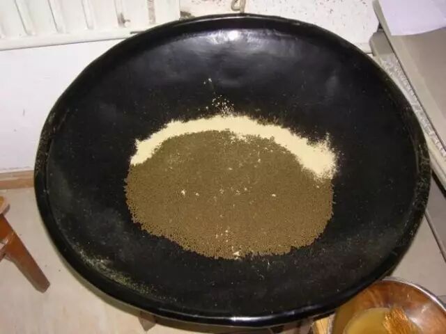 4、调药与和药:将熬炼好的蜂蜜用勺子倒入消毒盆盛装的药粉内,同时用粗竹筷在药粉内搅拌,就象平时做饺子前加水和面一样,边倒蜂蜜边调药粉,当基本上看不到干药粉时停止加蜜(注意不能加得太多,蜜多了药丸不易成形)。如果开始时蜂蜜的总量没掌握好,此时在调蜜时就可根据药粉的干湿度来补救。调好后,像和面一样将药和蜜在消毒盆内和成团状。
