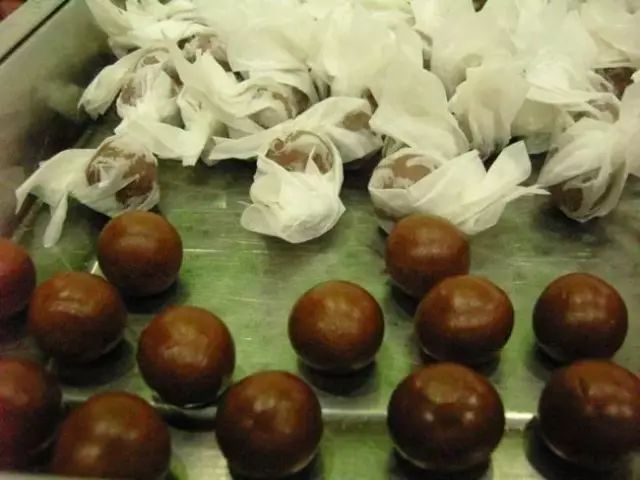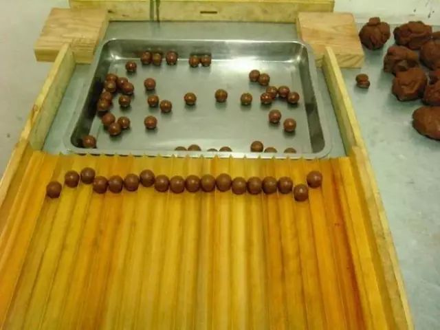 5、搓条与和丸:为避免药团粘手或粘器具,搓条与和丸时可用少量甘油、芝麻油或花生油等点于掌心进行,这样不仅不易沾粘,还能使丸药圆滑光亮。如按每粒丸药重10g计算,一料共重3000g,就要做成300粒。可将和好的药团分为三坨,每坨再分为5小坨,每小坨搓条后,切为20节,每节搓一丸即可,余皆准此。