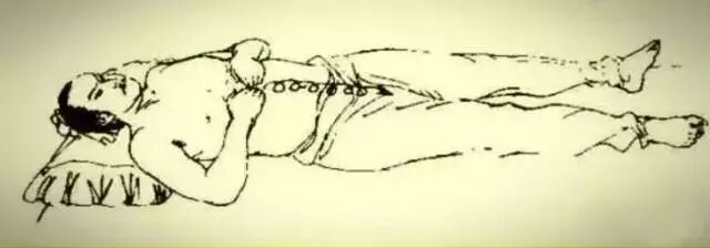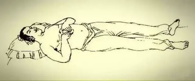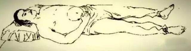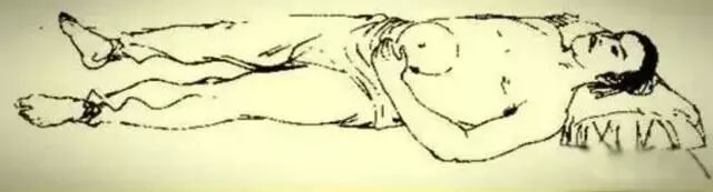 在保暖的前提下,脱衣松裤,正身仰卧在床上,最好能够枕在矮枕上,全身放松,凝神静虑,调匀呼吸,舌抵上腭,意守丹田。
