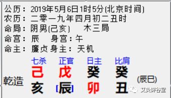对应的四柱命卦是:己亥年,己巳月,癸卯日,丁巳日。