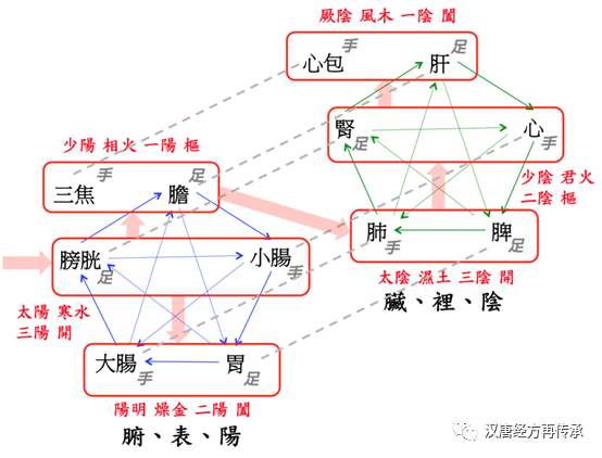 上面的部分,问题不大,许多医家都做类似的阐述,有些也借用太极图或十二时辰的阴阳起伏来一并解释。不过,这其中有个问题却少有医家从正面来讨论,那就是六经里阴阳经的对应性质。六经里,太阳经和少阴经对应,阳明经和太阴经对应,少阳经和厥阴经对应,一般对这样阴阳经对应的解释,都是利用脏腑表里对应关系来说明,肝胆互为表里、心小肠互为表里、脾胃互为表里、肺大肠互为表里、肾膀胱互为表里、心包三焦互为表里,所以,「想当然耳」,太阳经就对应到少阴经,阳明经就对应到太阴经,少阳经就对应到厥阴经。然而,这样的推理过程,似乎有些本末倒置,毕竟当我们单纯从经络的角度来讨论人体模型时,经络优先于脏腑,应该不需要借用脏腑表里来解释,反而应该能从经络对应的角度来解释脏腑为何会有如此的表里对应。