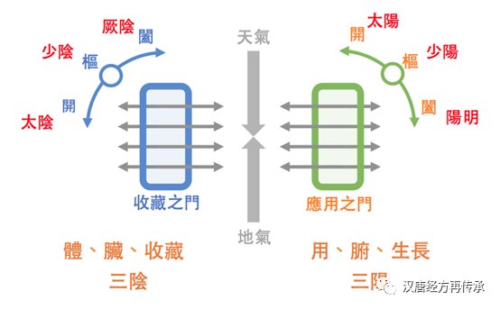 或许有读者会问,为什么「应用之门」和「收藏之门」的开、阖、枢对应关系不是对称的?「收藏之门」大开时,似乎也可以对应到「应用之门」的「枢」,这样既可以避免收藏的能量外泄太多,也可以同时应付外界的能量应用需求?这样不对称的关系,是来自能量「应用」及「收藏」本质上的不对称性,无论外界提供人体多少的「天气」、「地气」,人体能够收藏的份量是非常有限的,但经过人体转化而拿去应用的份量却可以非常大。这样本质上的不对称,导致在控制「收藏」上会更加保守,以增加保障。因此,在「应用之门」和「收藏之门」的开、阖、枢对应上,太阳经和少阴经对应,阳明经和太阴经对应,少阳经和厥阴经对应,以「设计」的角度来看,是最适合的安排。