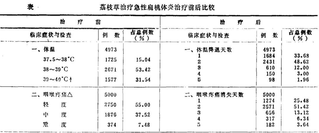从5000例治疗效果分析,荔枝草退热效果是迅速的,大部分病例能在服药后体温降至正常;随着体温下降咽喉疼痛症状显著减轻。血象恢复正常。治疗后扁桃体缩小的病例数虽有上升,但不能在短期内恢复正常,恐是病理改变与机体修复过程有关。通过5000例临床观察,说明荔枝草具有消炎,抗菌作用,值得推广。