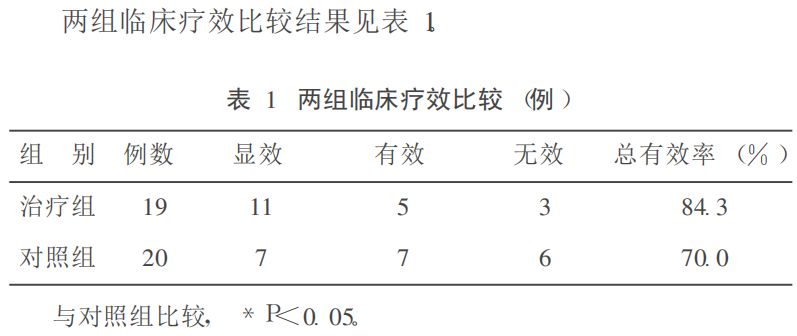 共观察治疗39例,均为我科门诊患者,随机分为治疗组和对照组。治疗组19例中,男10例,女9例;年龄5~11岁;平均9.2岁;病程30天~2年,平均6.5个月。对照组20例,男10例,女10例;年龄3~12岁,平均8岁;病程38天~2年,平均8.5个月。两组临床资料比较,无显著性差异(P>0.05),具有可比性。