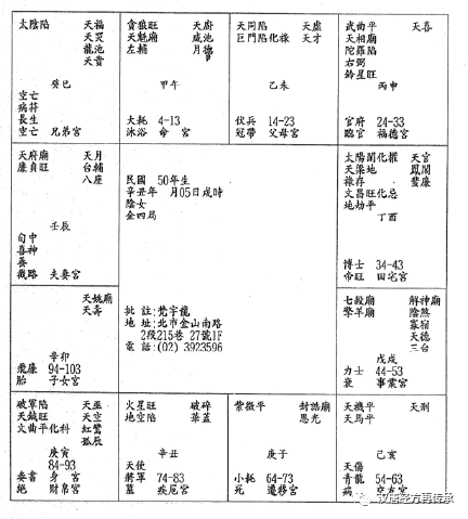 在34-43岁,这十年代表先生。看她44-53岁,七杀星在本宫,值令星是七杀星,代表44岁以后她一个人孤军奋战,辛苦做事。这个人是民国50年生的,到民国83年是34岁。小流年从戌宫开始起止,辛丑年,肖牛。在未宫是1岁、13岁、25岁,37岁、49岁。男孩子顺转,女孩子逆转,34岁落在戌宫,是事业宫,对宫是夫妻宫。