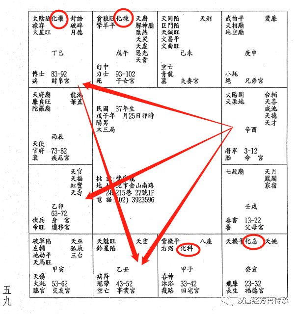 我们掌握的人间道,就是易经的原理,地理位置的应用,卦的变幻,易经的演绎。算命就变成一个工具,让我们事先知道发生什么事情,我们事先去预防,这就是我们研究算命的目的。这是正统老祖宗的东西。外面很多算命,只是算命,只有三分之一,算出来同时间生的人都一样,算出来不能解,没有功能。实际上,我们在解的时候,要地理位置和人事加起来三分之二才能大于天命。如果天文地理人事非常娴熟的人,一定是精于医理的,一定懂医。举例,一个人有心脏病,算命算出来他有心脏病,地理位置你不要住中间是厕所的房子。他说他住的房子正好是厕所在中间,他把房子改了,地理位置和天命在拼的时候,是三分之一对三分之一,如果利用医学技术把心脏病治好,这是人事的医理。因为他来算命的时候已经有病了。人间道,把人世间的事情看的很清楚的时候,人很愉快,是平常心,没有喜怒忧思悲恐惊,不受周围环境的影响,每天都很开心,从内心里发出来的欢喜心,所以你不会有病。再加上地理位置,就变成良性循环。但如果已经有病了,要借助医学技术,再精通医理的话,没有什么问题不能解决。正式开始批的时候,我们会从天文讲到地理,讲到人事。一边批一边讲。为什么拿这个八字举例?这个人来算的的时候已经死了。来算命的是他太太,印堂是白色的,这个白不是润白,是枯白,白的暗淡无光,牙膏挤出来放很久,没亮光了,变成白白的,就像牙膏和泥巴和在一起,放在那里的颜色。面色白色,惨暗的,面带丧。脸上就写着我在带丧,看到心里已经有数了,再看他先生的八字,福德宫化忌。福德宫化忌,福德宫主一世的福禄,化忌就是一世都不顺,很累。过去算命,如果没有人和地,这种人去当和尚,入僧庙入僧道,可能可以化解。这种化解是消极的。1,财帛宫是化权和禄存在一起,这叫权禄相逢,权禄相逢的人,一定会去做事业当老板。2,身宫在迁移宫,身宫是后天的发展,他不但做生意当老板,而且会发展到外地去。3,日月反背,太阳在酉时下山了,太阴在巳时。这叫日月反背格,所以他的事业是白天忙了晚上还要忙,加倍的辛苦。