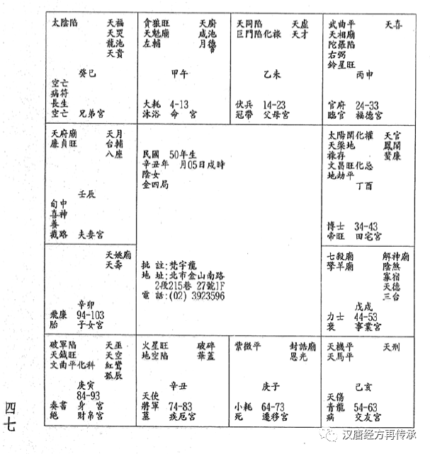 进入36-45岁这个大运的时候,40岁会到未宫,40岁红鸾星才会动。进入36-45岁这个大运的时候,40岁会到未宫,40岁红鸾星才会动。如果他继续住西北角不动,他娶的太太应该是有过婚姻的,而且年龄比他大,会有这种现象。疾厄宫,这个人子时化忌,最凶的在胆。七杀在午宫,七杀是杀星,没有遇到吉星来会,所以午宫也不好,午宫是心脏。光算今年的灾,未宫虽然没有星,但是对面是日月科禄来会,因为未来十年有大运,所以33岁虽然大小二限逢,只是小灾,不会有大灾。有的人的灾是车祸的灾,这是外形上面的灾,他这个灾,财帛上的灾,那一年的大运走到财帛,是他感情上的灾而已,他只要不去做生意当老板,这个灾就不会有。所以,33岁的灾变成感情上的灾。他来找你算命就是想问这个问题。还有个问题,红鸾星在子女宫,34岁照样会生孩子,但是不会结婚,会先有子,40岁以后再结婚,算命不管原因,只管结果。算命是谈果,很多宗教是谈因。一般红鸾星入子女宫,会先有孩子。一般来说,延年方取他的吉位。像辰宫的方向很吉,巳宫和亥宫也比较吉。一般改阳宅,住家脚的方位,朝健康的方位,读书书桌的方位,朝向化科的方位,书桌在哪个房间都无所谓,要朝着科甲的方向。比如,我们改这个人的科甲,这个人的卧房从西北改到东宫,读书的书桌改为面朝东,我们给他讲是朝东,我们专业讲是朝辰的方向,如果是做生意的老板,桌子要朝禄的方向。巳宫是化禄,寅宫的贪狼是禄,亥宫的禄存也是禄。如果禄和忌在一起的时候,我们不能朝禄和忌的方向,禄和忌是什么样的状况,公司结余一看账上都是赚钱的,支票都是跳票的,赚钱,但是要去法院想办法把钱追回来。这是禄和忌会在一起的情况,就变成这种状况。如果像这种,科权会命的人,官做得很大的人有官相,两个眉毛很开,所以,倪师常叫大家抬眉,这个相是一直改变的,像李登辉以前还是很窄,在农复会还是很窄,越来越宽。