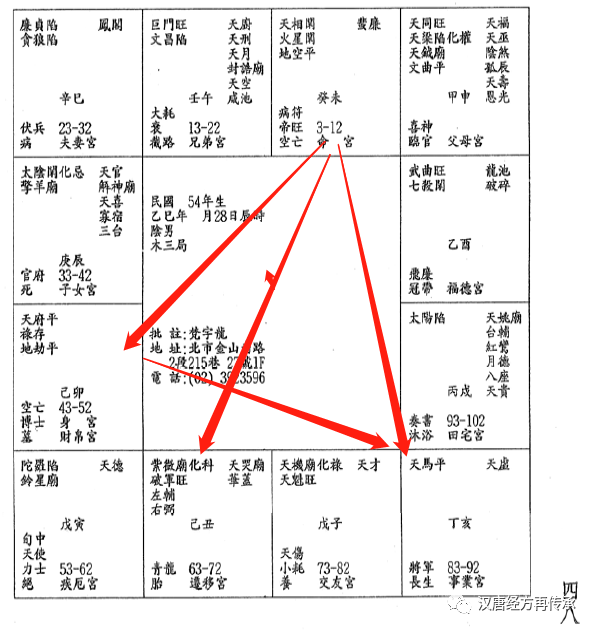 这个八字为什么提出来?夫妻宫是天同文昌,一个女人的命拿到太阳,先生的命跟她比起来太差了,就会变成半吊子,条件很好的男人不需要她,不需要女孩子这么会赚钱。条件不好的,需要仰赖她的,就会进来了。红鸾星在25-34会动,因为都是吉星来会,对面又没有杀星,对面是太阴化禄加天喜,一个解释是她的婚姻受到她妈妈的左右,妈妈也同意,就结婚了。民国37年是戊子年,1岁在戌宫,26和32岁会到红鸾天喜星,这两个流年在命上是完全不一样的,25-34走红鸾星的流年,第一个限是26岁,26岁会到天喜星,对面是红鸾星,她就会结婚,因为没有杀星,算命红鸾星要过限,为什么要过限?因为他福德宫化忌,女人的福德代表一世的福禄,也代表夫妻,26结婚,28岁就到化忌,如果她26岁结婚,婚姻就只有两年,过去算命的会说小姐你26岁结婚不好,32岁再结婚比较好。这是算命的方法,是消极的。还有一个更惨的,26岁结婚,27岁本宫是南北斗星君,对宫是子女宫,所以会生一个儿子再离婚。如果晚一点生还好,生了孩子再离婚比较麻烦。这个女孩子太强了,不容易遇到好人。遇到好的又看不上她。这种就是男命女身,有一个特别的名词叫雌雄同体,不需要男人了,男人看到也不喜欢。可是做事业很强。非常厉害。