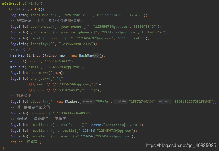 log.info("your email={}, your cellphone={}", "123456789@qq.com","15310763497");