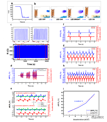 图3. 基于液态金属的惯性传感器角色塑造。(a 和 b)通过控制 LED 的强度和电极的相应电阻变化作为 LM 液滴位置的函数,可视化 LM 启用的可变电阻概念的时间推移序列图像。(c) LM 型惯性电阻传感器循环滚动试验的输出。(d)惯性传感器的电阻变化输出相对于参考加速度计的输出随机应用运动。(e)当沿 x 和 y 方向分别施加加速度时,组装的两轴传感器的输出。(f-h)惯性传感器在轴加速度下的电阻变化输出随0.5 -2赫兹加速度频率的变化。(i)输出电阻随加速度的变化。