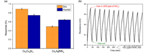 图4.在干燥和潮湿(70%R.H.)环境下,石墨烯上负载的Cs3Cu2Br5和Cs2AgBiBr6 NCs在室温下对NO2的传感响应的比较(a)。通过在室温下连续暴露NO2(500 ppb)对Cs3Cu2Br5 NC进行重复性试验(b)。