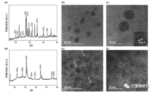 图1.Cs3Cu2Br5(a)和Cs2AgBiBr6(d)钙钛矿纳米晶体的XRD图谱。Cs3Cu2Br5(b,c)和Cs2AgBiBr6(e,f)纳米晶体在不同放大倍数下的HR-TEM图像。