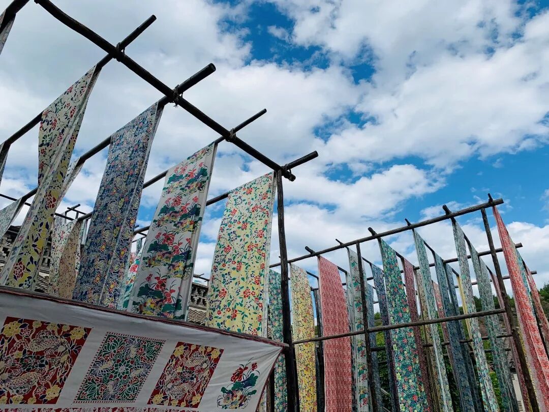 那么,在古北水镇,这一装置艺术也得以被继承复制,并在印花方面进行了本土化改造,把清秀的蓝染布调整成了热情奔放的花布。