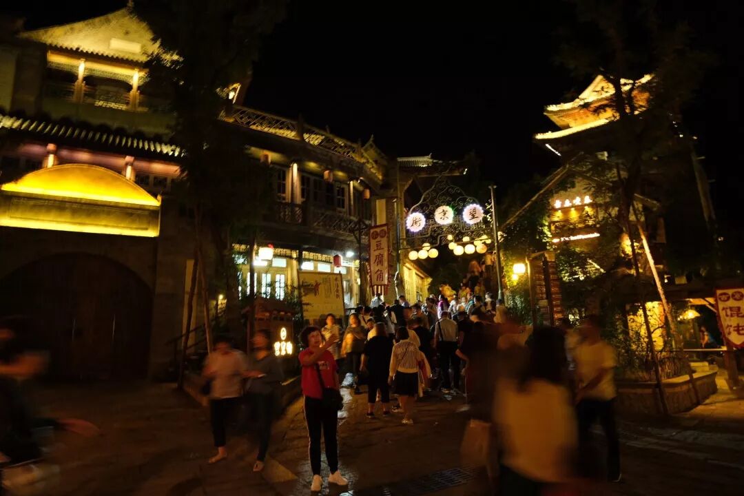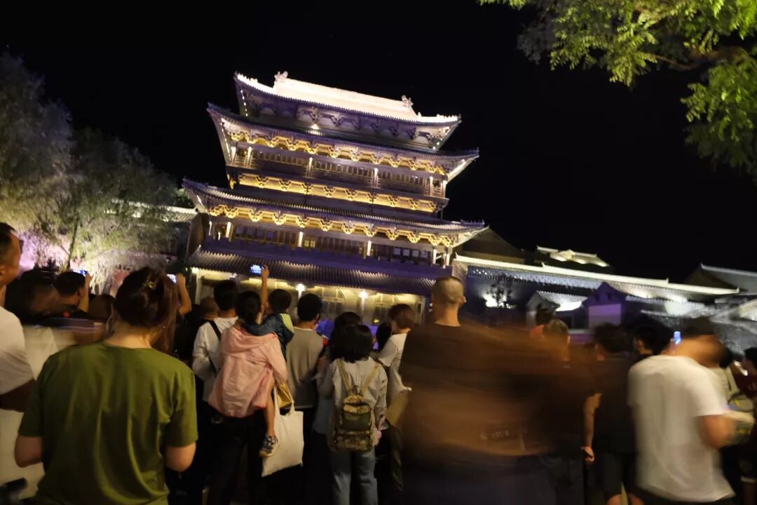 到了夏天,古北水镇游人如织,夜间镇里遍布仿古的暖黄色灯光,小广场上有不断变换阵型与色彩的无人机表演,还有灯光音乐喷泉秀。人群熙熙攘攘,在一些地方同时停下来,齐齐望向光与影最集中的地方。有人穿着租来的汉服,似乎真的回到了古代的庙会之中。