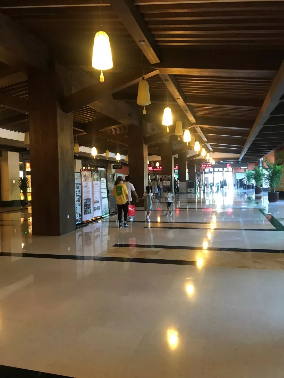 说到小镇入口真的要赞美一下,古镇的出入口在室内,是个明亮的大堂,完全没有别处景区入口那种拥挤炎热的感觉。木质棚顶,瓷砖地面,古法小灯,安检入场。很容易给人种“穿越到了古代并把现代科技带来的美好生活一并带了回去”的网文小说式幸福感。